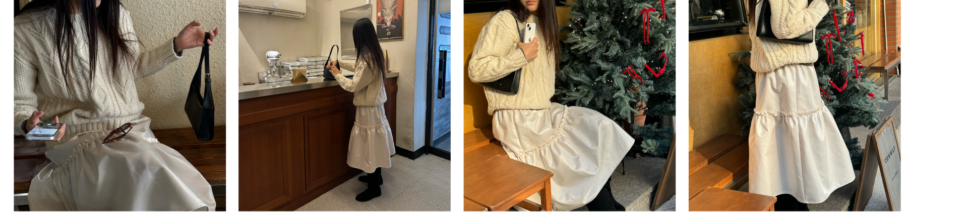광택감이 포인트인 소재를 사용한 사랑스러운 2단 러플 스커트입니다. 볼륨감 있는 패턴에 롱한 기장으로 봄 가을 겨울 시즌 리스로 착용하기 좋은 스커트입니다. 봄 시즌 많은 사람을 받은 졸리 러플 스커트에서 변형된 디자인으로 겨울 시즌 다양한 스타킹과 함께 착용하시기를 추천드립니다.
