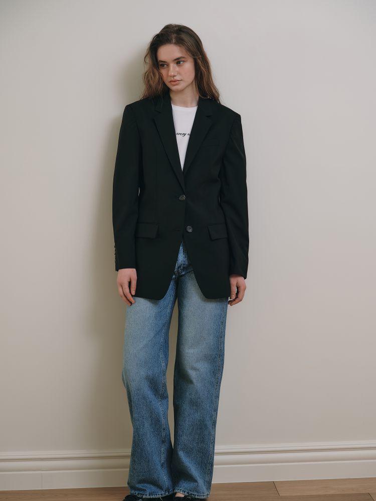 - 투 버튼 고급 블랙 자켓은 어느 스타일링에도 완성도를 높여주는 필수 아이템입니다.