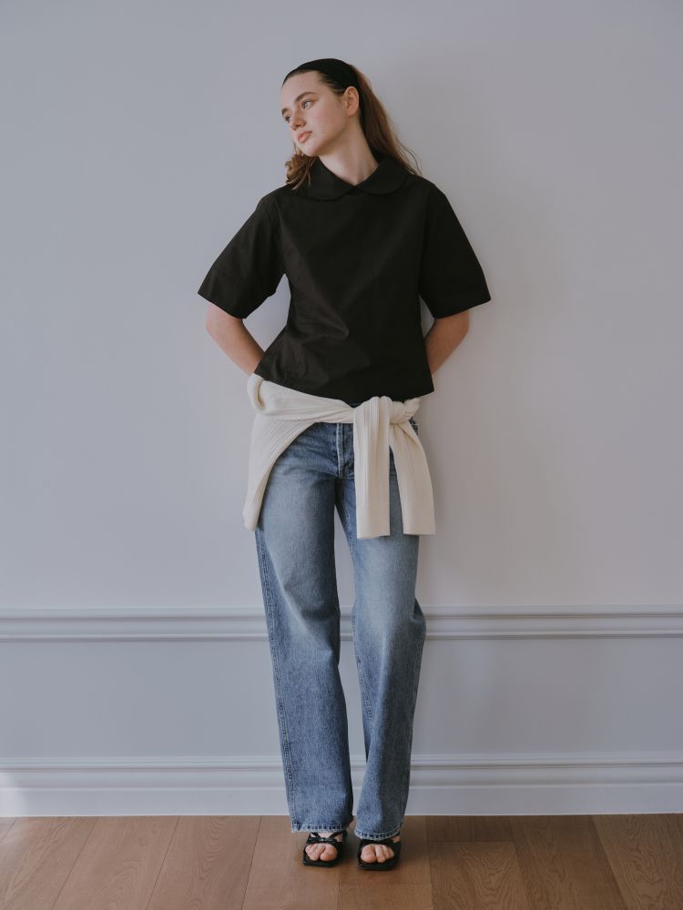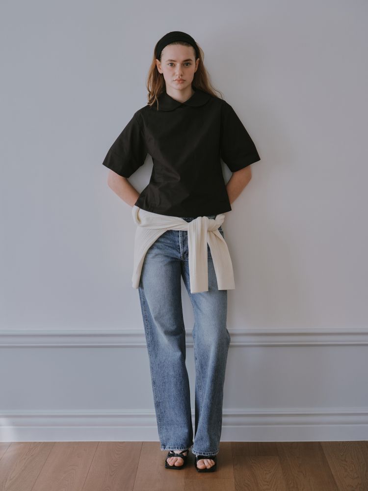 - 라운드 스탠 카라와 입체적인 패턴으로 여성스러움을 강조한 반팔 볼륨 블라우스입니다.