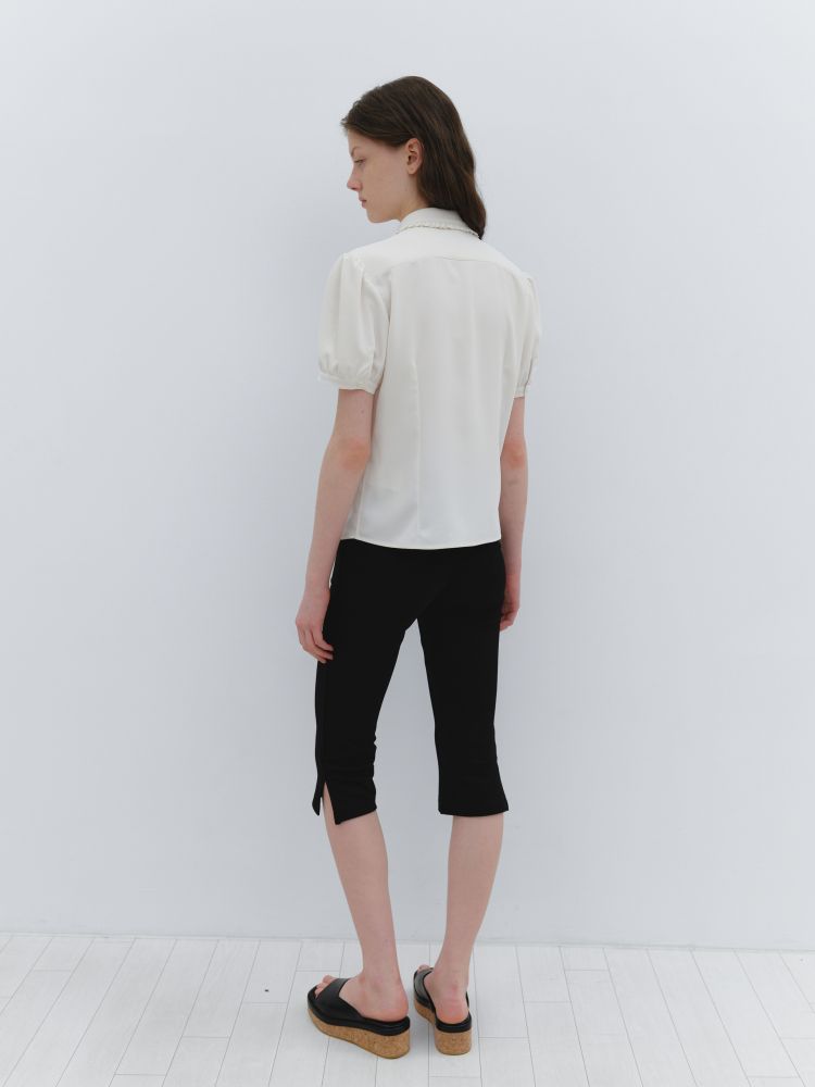 사랑스러운 무드의 부드러운 쉬폰 소재로 제작된 슬림핏 숏 기장 블라우스입니다. 퍼프소매와 카라에 프릴을 넣어 포인트 주었습니다. 데일리로 입기 좋은 아이템입니다.