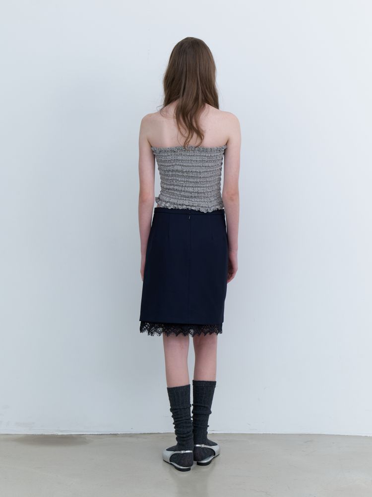 은은하고 고급스러운 광택감이 있는 소재를 사용한 H 라인 스커트입니다. 밑단에 레이스를 디테일을 추가해 로맨틱한 무드를 연출하였으며, 이번 시즌 트렌드인 미디 기장으로 디자인하였습니다. 부드러운 망사 지퍼를 사용하여 여밈 할 수 있도록 하였고, 블랙에 가까운 딥한 네이비 컬러로 제작하여 다양한 컬러의 상의와 연출하기 좋은 아이템입니다.