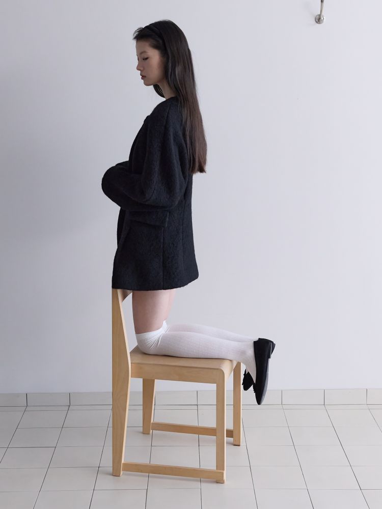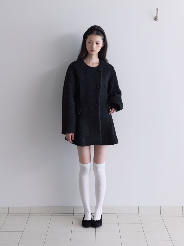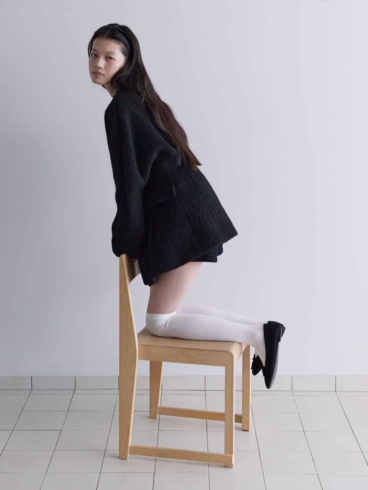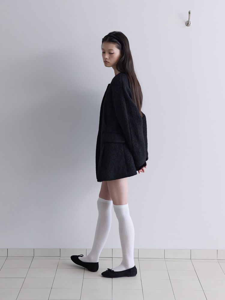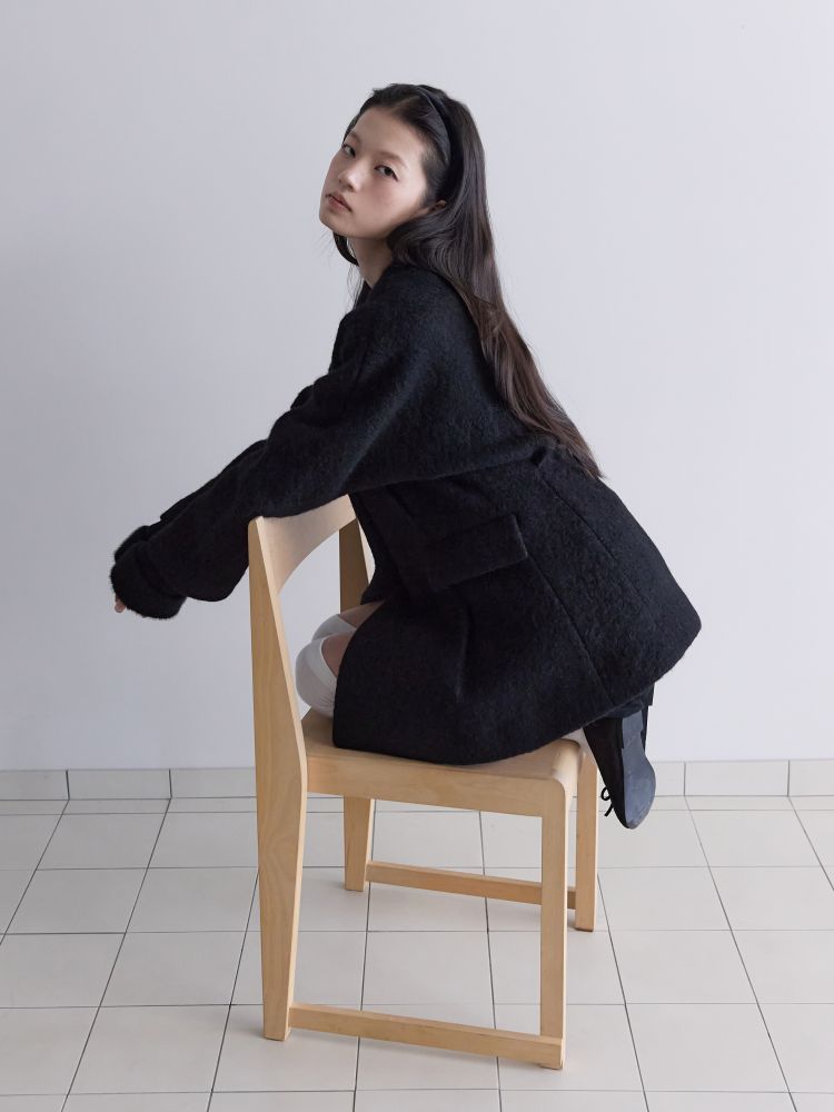 아방가르드한 실루엣의 프리미엄 알파카 원단으로 제작된 하프 자켓입니다. 어깨선을 자연스럽게 드롭시키는 래글런 소매 패턴에 허리를 강조한 디자인으로 자연스럽게 생기는 주름과 볼륨이 특징이며, 전체적으로 여성스러운 핏의 자켓입니다. 같은 원단의 싸개 단추를 사용하여 고급스러움을 더 했습니다.
