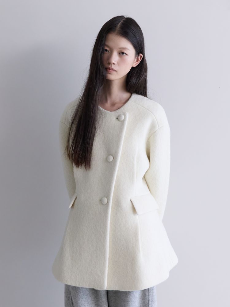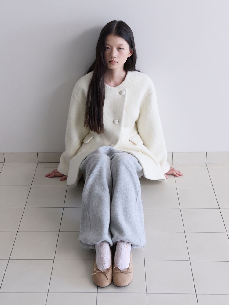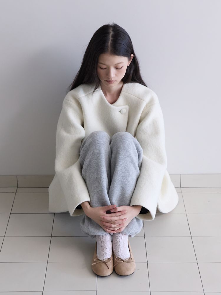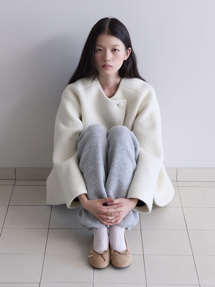 아방가르드한 실루엣의 프리미엄 알파카 원단으로 제작된 하프 자켓입니다. 어깨선을 자연스럽게 드롭시키는 래글런 소매 패턴에 허리를 강조한 디자인으로 자연스럽게 생기는 주름과 볼륨이 특징이며, 전체적으로 여성스러운 핏의 자켓입니다. 같은 원단의 싸개 단추를 사용하여 고급스러움을 더 했습니다.