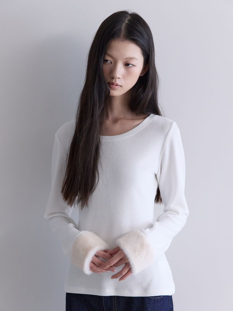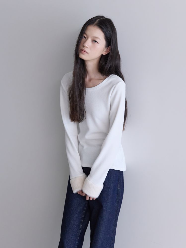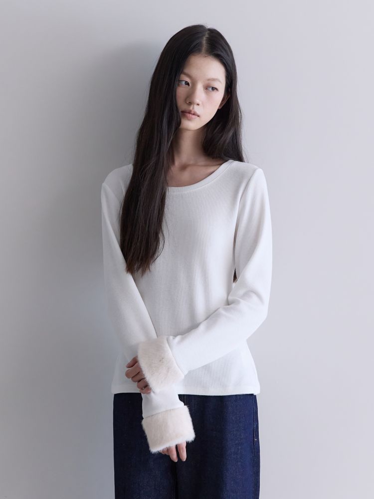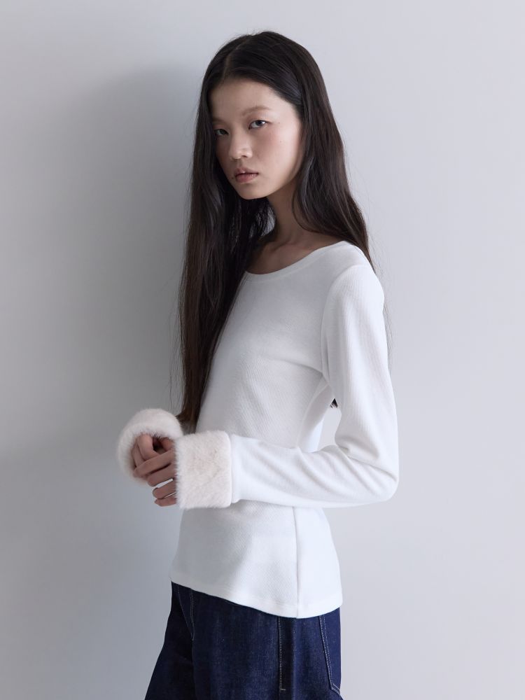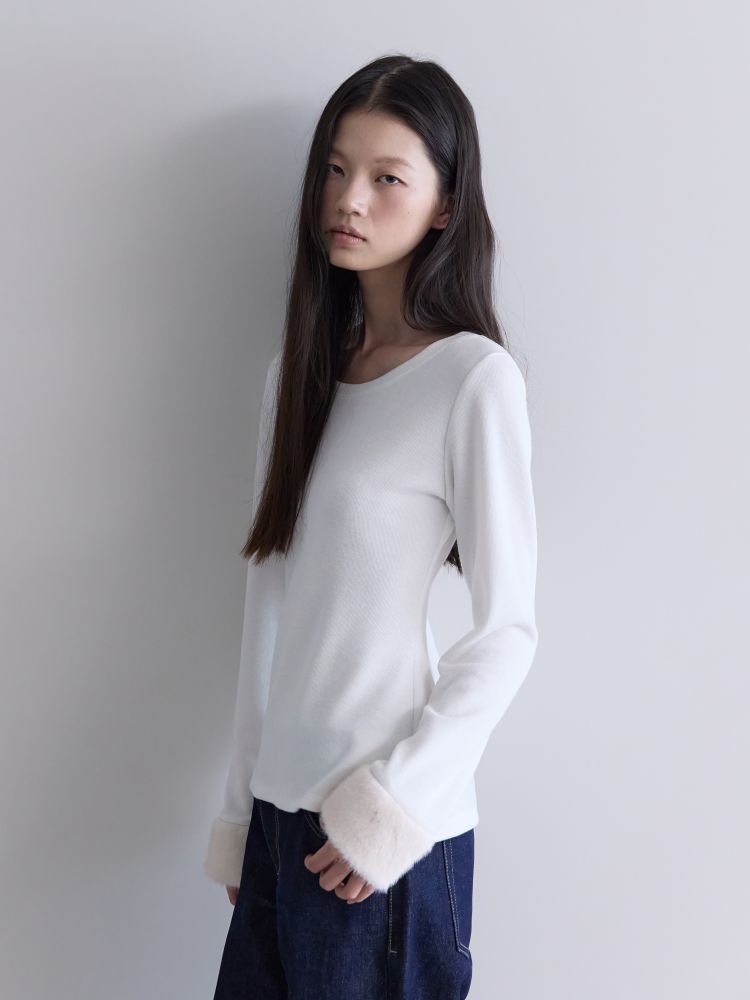 기모 처리가 된 원단으로 보온성이 뛰어난 이너 제품으로 소매에 밍크 퍼가 포인트로 달려 특별하게 연출 가능한 티셔츠입니다. 허리를 잘록하게 보일 수 있도록 슬림하게 제작하였으며 바디와 퍼를 톤온톤으로 구성해 다양한 하의 제품과 스타일링 할 수 있도록 디자인하였습니다.
