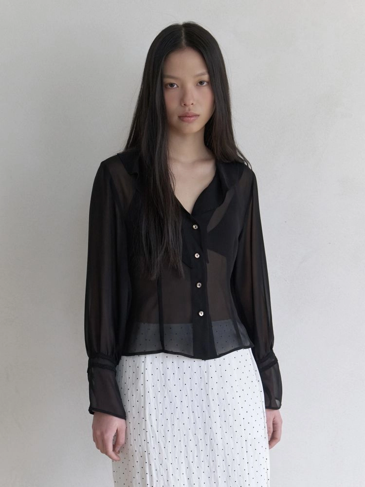 카라를 따라 흐르듯 떨어지는 러플 디테일이 전체적인 선을 부드럽게 정리하며, 사랑스러운 분위기를 연출하는 블라우스입니다. 은은하게 비치는 시어한 소재를 사용해 가볍고 섬세한 무드를 더했으며, 여성스럽고 여린 감성을 자연스럽게 표현했습니다. 소매에 더해진 레이스 포인트는 디테일의 완성도를 높여주며, 움직일 때마다 우아한 분위기를 더합니다. 부드럽게 흐르는 실루엣이 러블리한 무드를 완성해 데일리룩은 물론 특별한 날에도 로맨틱한 스타일링을 연출하기 좋은 아이템입니다.